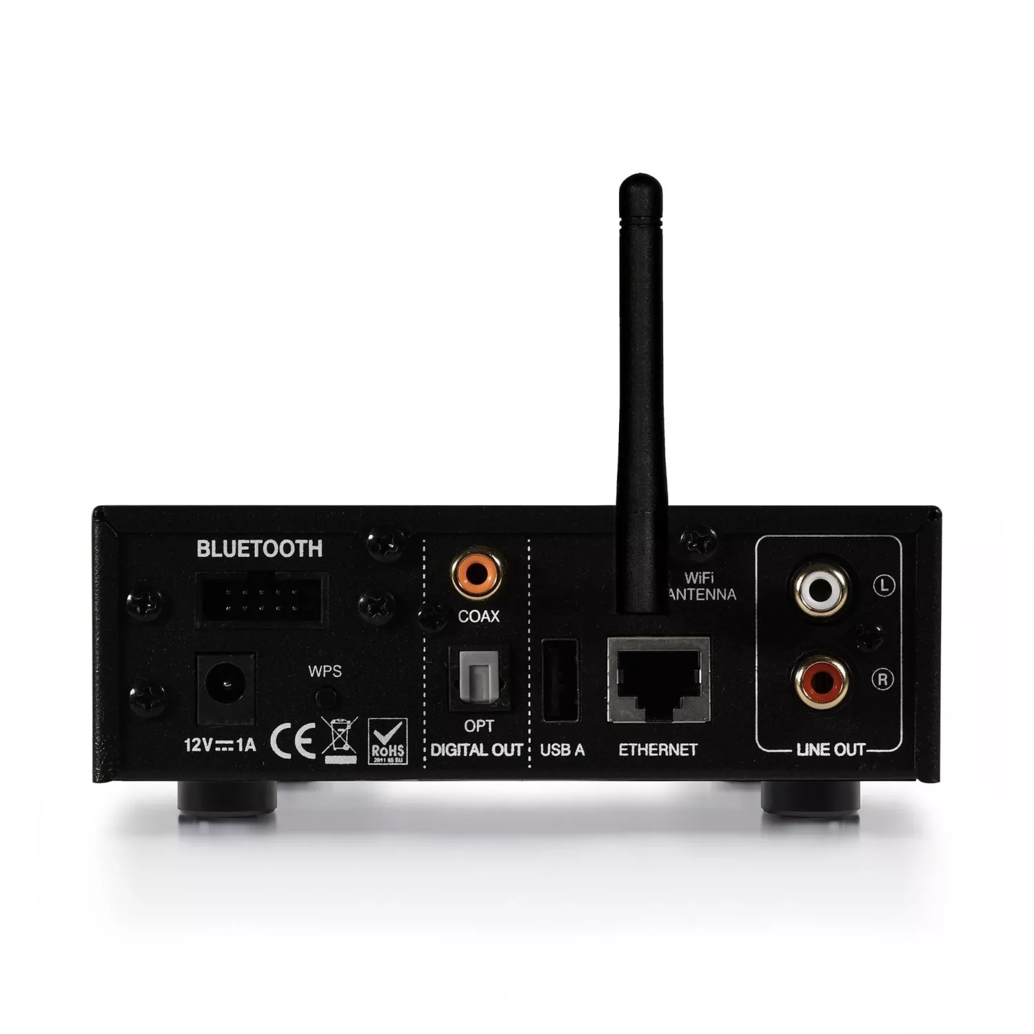 Enheten kan anslutas trådlöst via Wi‑Fi eller med nätverkskabel (Ethernet) och stödjer en lång rad streamingkällor: