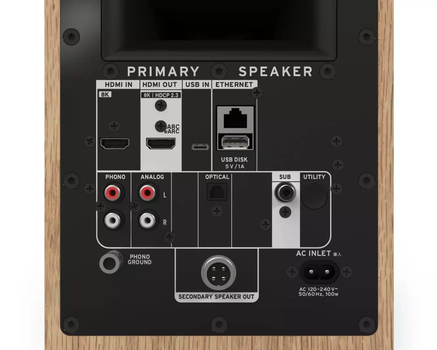 • USB-C (för dator), optisk, analog och phono (för skivspelare)