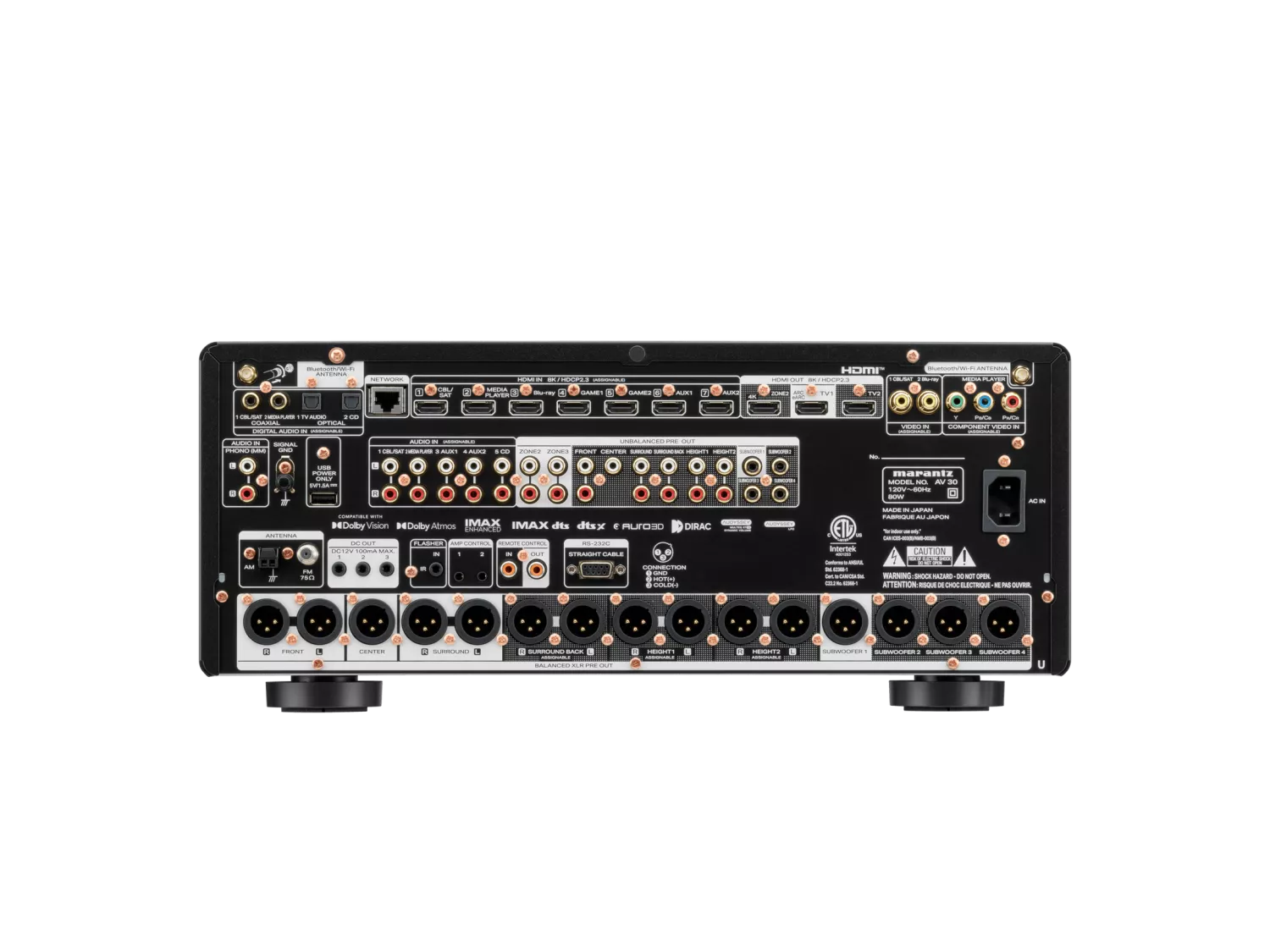 För rumskorrigering levereras AV 30 med Audyssey MultEQ XT32 som standard. För den som vill ta anpassningen ytterligare ett steg finns Dirac Live tillgängligt som tillval, inklusive Bass Control och Active Room Treatment, på samma sätt som hos AV 20. På anslutningssidan erbjuds sju HDMI-ingångar med fullt stöd för 8K/60 Hz och 4K/120 Hz, samt tre HDMI-utgångar, varav en med eARC-stöd. Fyra helt oberoende subwooferutgångar möjliggör exakt basjustering även i akustiskt krävande rum. Samtliga flerkanaliga pre-out-utgångar finns både som obalanserade RCA och balanserade XLR, fullt utbyggda för 11.4 kanaler.