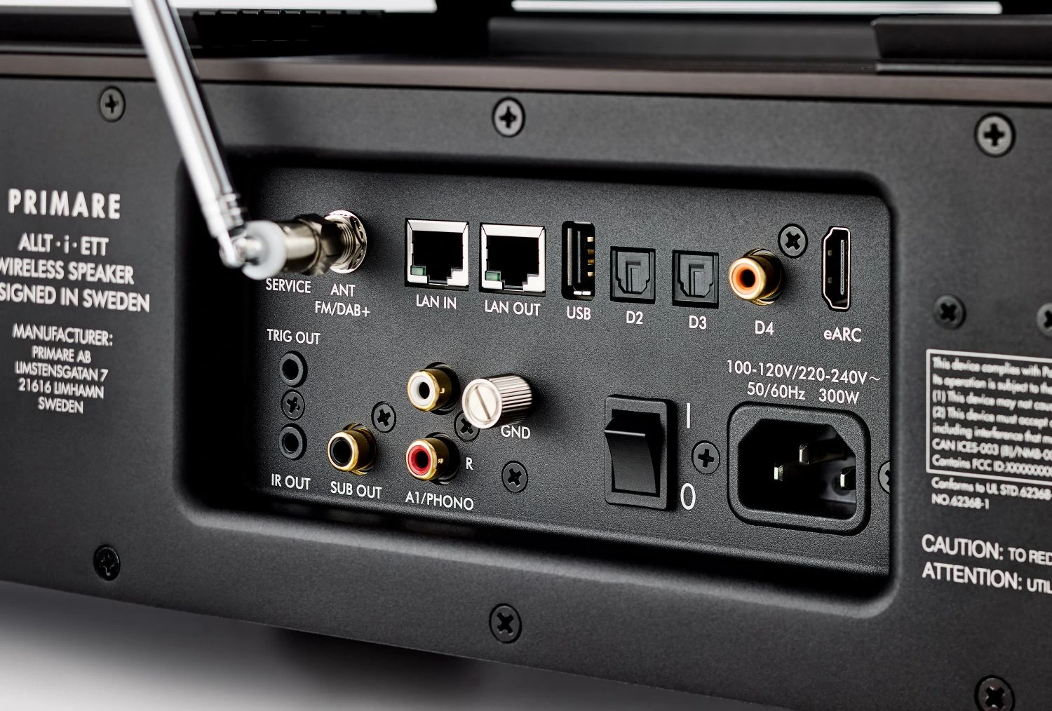 • Förstärkning: 300 W toppeffekt