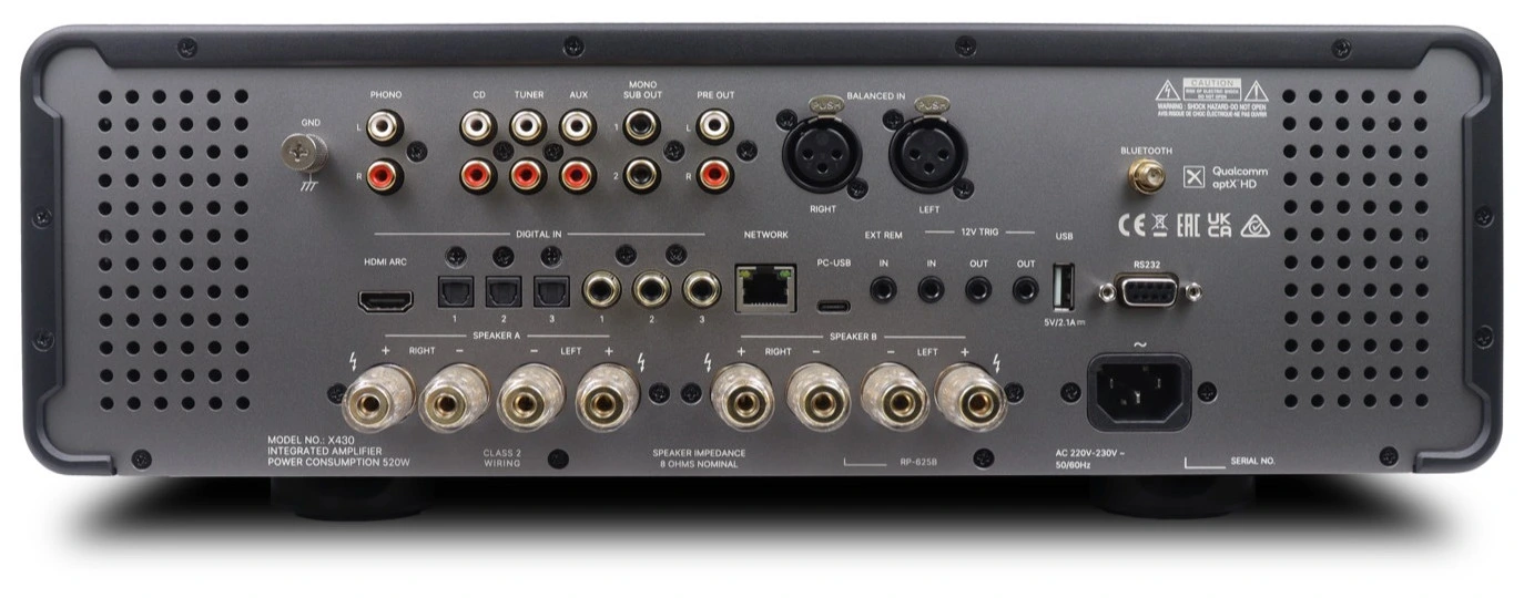 X430 är skapad för den kräsne lyssnaren som värdesätter både prestanda och flexibilitet. Med ett brett urval av digitala och analoga ingångar, samt Bluetooth med aptX™ HD och AAC, blir den en självklar centralpunkt i ett modernt system – även om fokus ligger på ren ljudkvalitet snarare än inbyggd streaming. Designen är lika imponerande som ljudet. Det massiva aluminiumchassit, den precisionsräfflade volymratten, glasfronten och den högupplösta färgdisplayen med VU-mätare och spektrumanalys skapar en visuell upplevelse i nivå med prestandan.